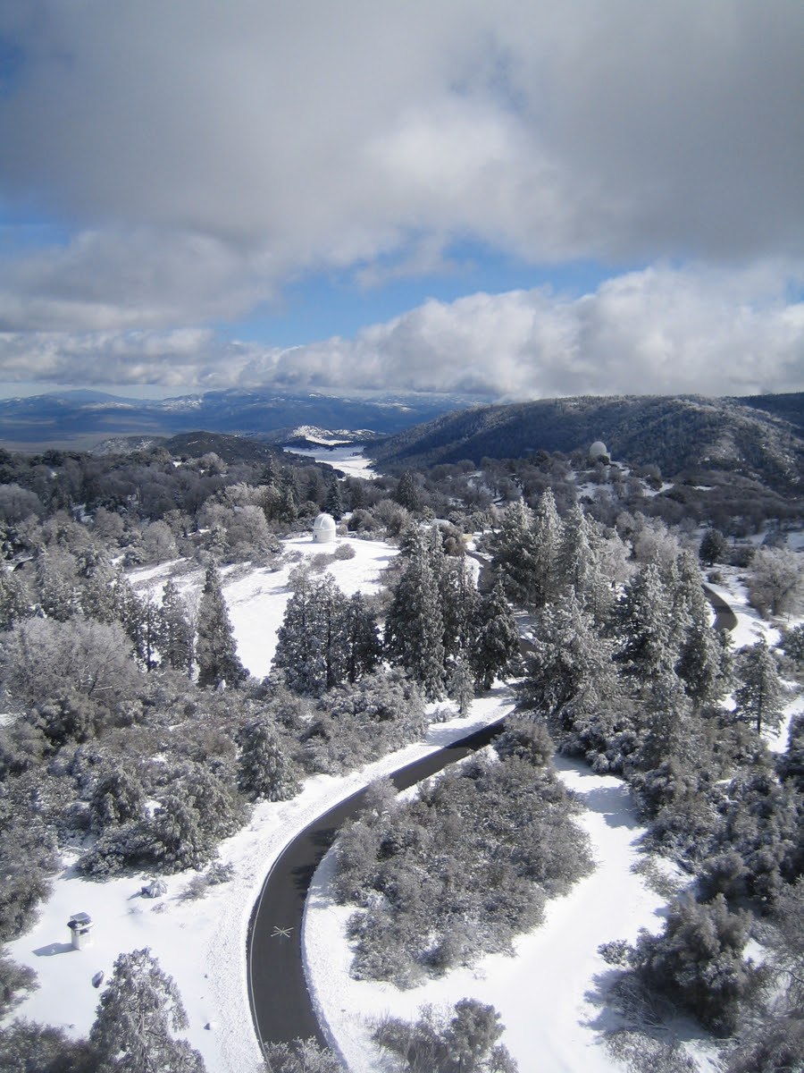 The photo above is looking roughly southward. You can see the little dome of the 18-inch Schmidt (center) and the much bigger (but much farther away) dome for the 60-inch telescope (right). You can also see the snow-filled Mendenhall Valley and the Crestline/Birch Hill ridge of Palomar Mountain (behind the 60-inch telescope at right).